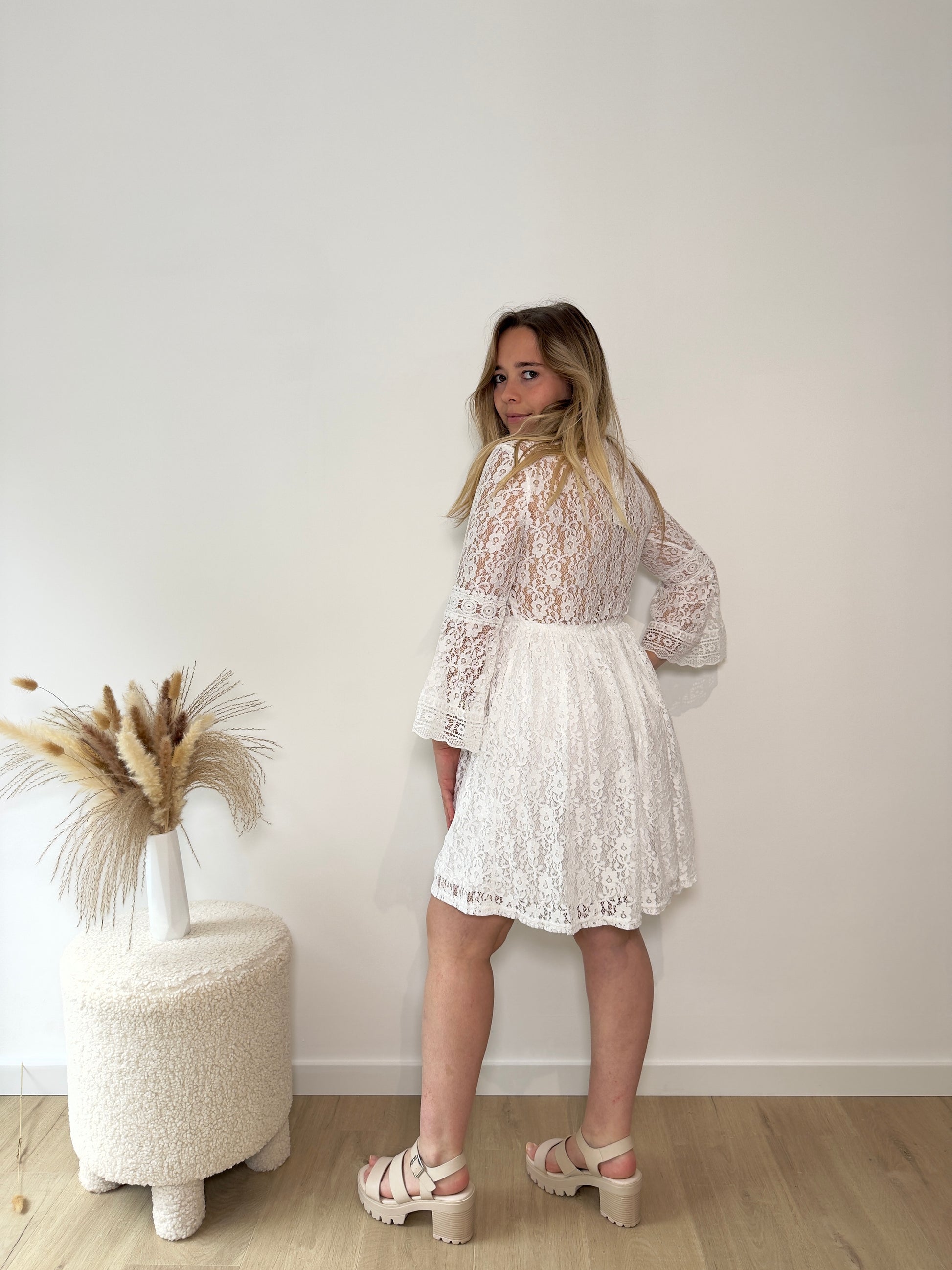 These short lace dresses in white and pink have a beautiful fit with wide sleeves. Lovely and airy, they're perfect for sunny summer days.