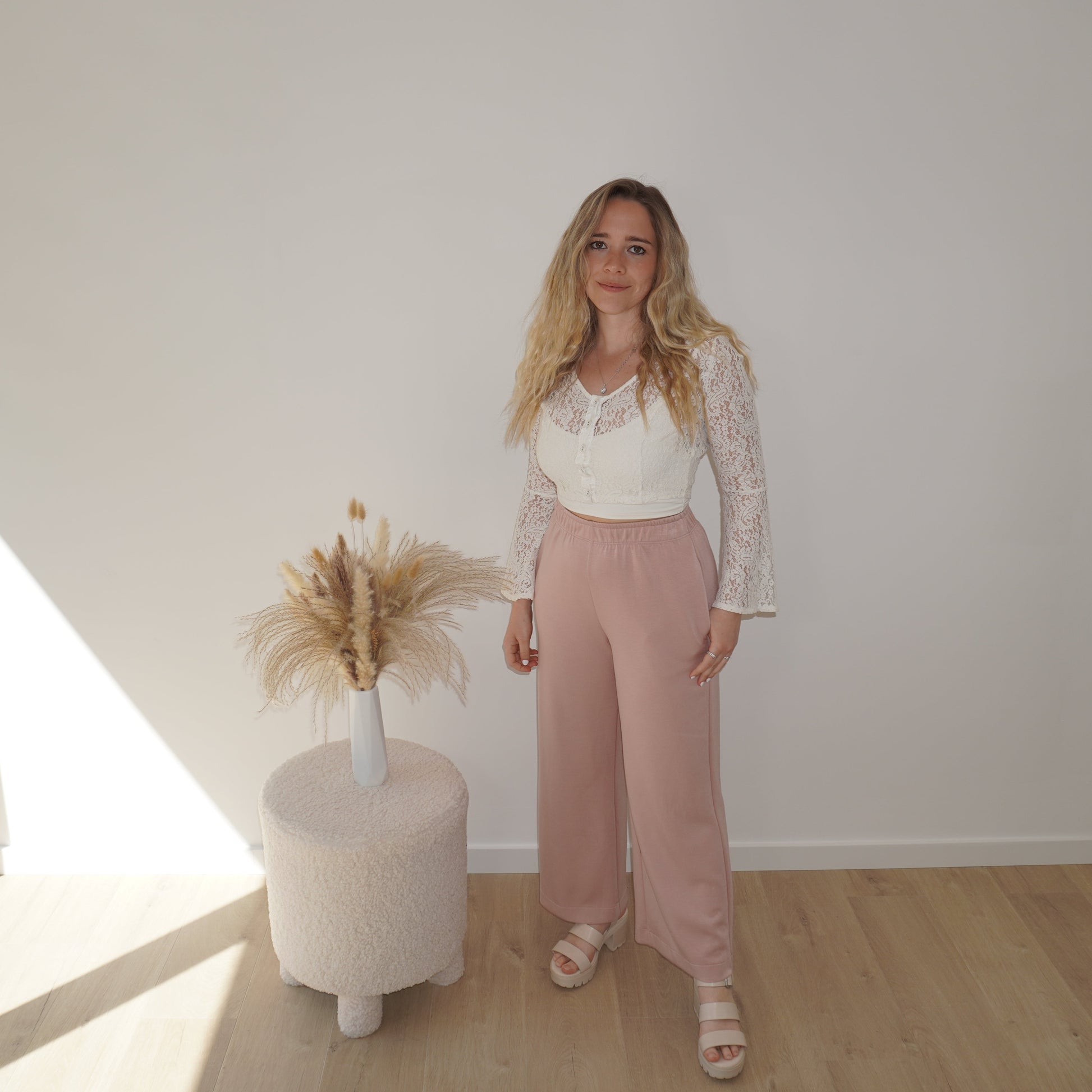 These stylish trousers are not only beautiful, but also super comfortable. Available in beige and pink, they can be perfectly combined with the matching sweaters for a complete look. Thanks to the elastic band at the waist, they fit nicely and give that little bit of extra flexibility.